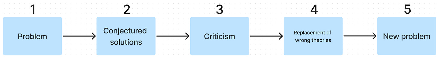 Popperian epistemology consists of 5 stages: (1) Problem; (2) Conjectured solutions; (3) Criticism; (4) Replacement of wrong theories; (5) New problem.