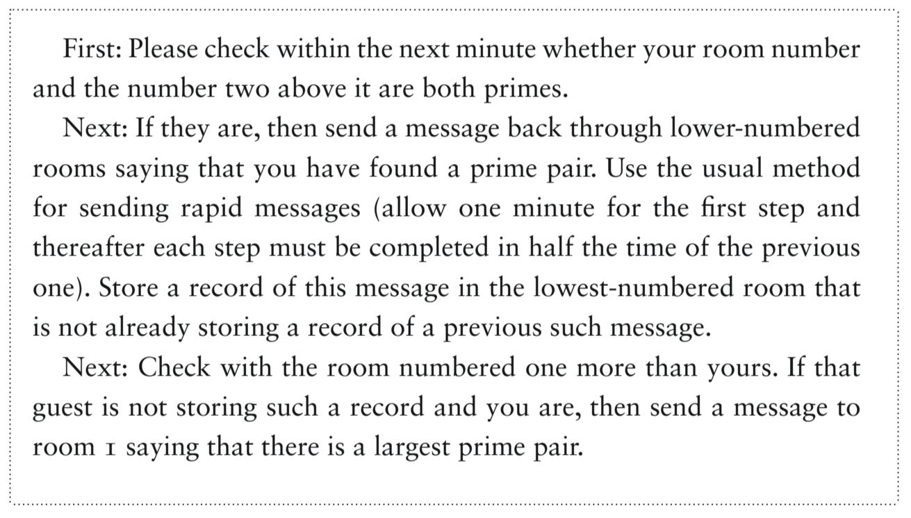 Now let us imagine this infinite set of possible programs arranged in an infinitely long list, and numbered Program 1, Program 2, and so on. … Let me define a class of logically possible environments which I shall call Cantgotu environments, partly in honour of Cantor, Godel and Turing, and partly for a reason I shall explain shortly. They are defined as follows. For the first subjective minute, a Cantgotu environment behaves differently from Environment 1 (generated by Program 1 of our generator). It does not matter how it does behave, so long as it is, to the user, recognizably different from Environment 1. During the second minute it behaves differently from Environment 2 (though it is now allowed to resemble Environment 1 again). During the third minute, it behaves differently from Environment 3, and so on. Any environment that satisfies these rules I shall call a Cantgotu environment. …