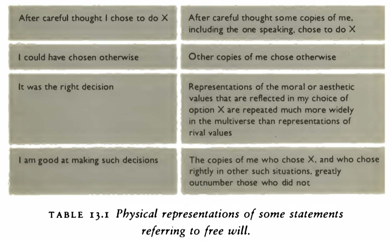 Consider this typical statement referring to free will: âAfter careÂful thought I chose to do X; I could have chosen otherwise; it was the right decision; I am good at making such decisions.â In any classical world-picture this statement is pure gibberish. In the multiÂverse picture it has a straightforward physical representation, shown in Table 13.1. â page 339